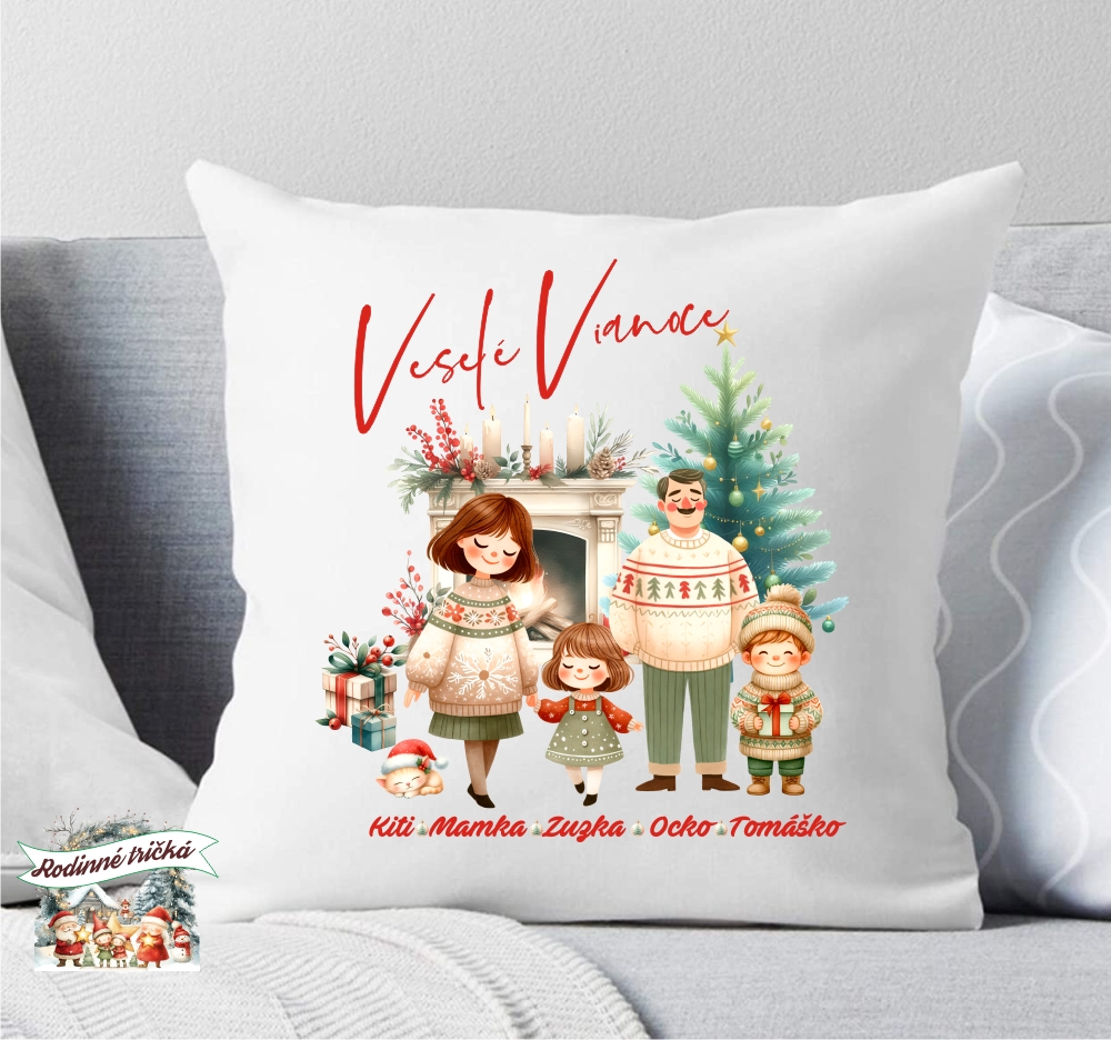Oživte si Vianoce rodinným vankúšikom. Milá rodinka pri krbe, v tichosti a pohode čaká na Vianoce.