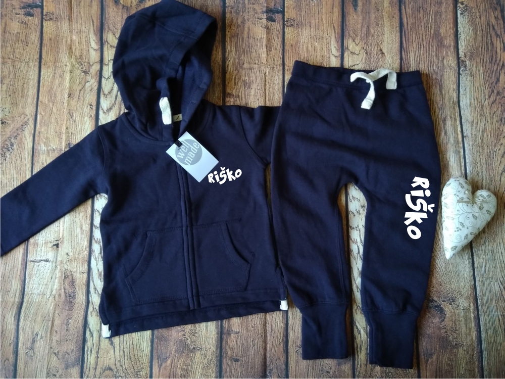 Kvalitná súprava pre chalanov. Bundička je na zips s kapucnou. Tepláčiky majú znížený sed. V páse je gumka.